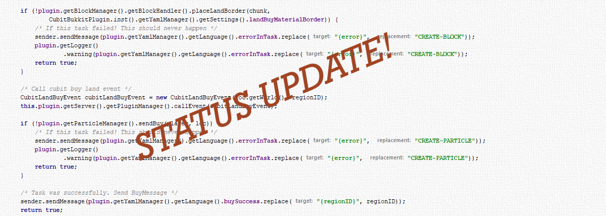 Im Moment sieht es nach außen ja so aus, als würde nichts am Server verändert werden. Dies ist aber das genaue gegenteil :D. Das Problem ist nur, als Spieler sieht man diesen Fortschritt nicht. Und zwar werden aktuell die Hauptplugins von MineGaming auf den neuen Server aktualisiert. Darunter fallen Cubit (Unser Grundstücksplugin), die MineSuite (Alles Homes/Warps und Teleport Befehle) und das Gildenplugin. Da für das Gildenplugin in der Zukunft einiges in Planung ist, muss dies extrem angepasst werden. Mann könnte fast sagen, dass es neu Programmiert wird.